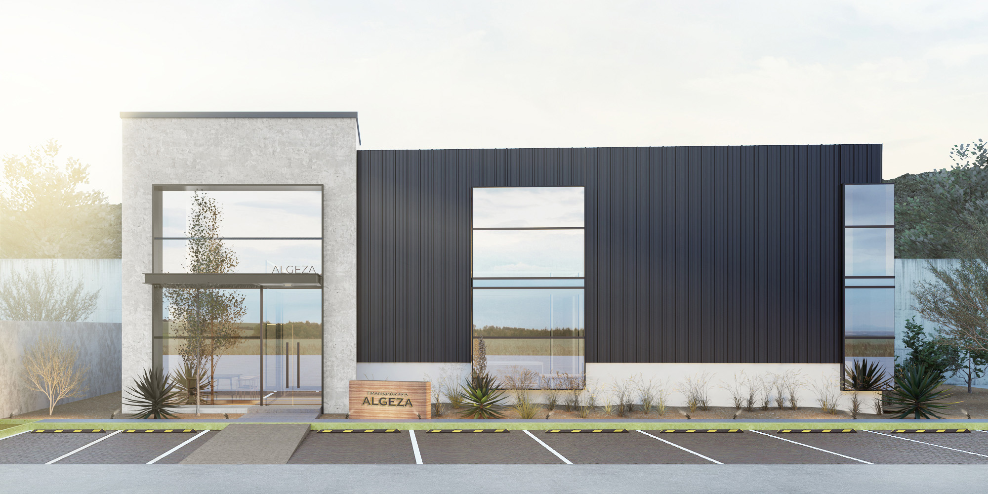Material selection is direct and restrained. Exposed concrete and black steel define the building’s structural presence, while glazing is used selectively to regulate transparency rather than maximize it. Exterior openings frame views toward the service yard and landscape, reinforcing the building’s relationship to its operational context.