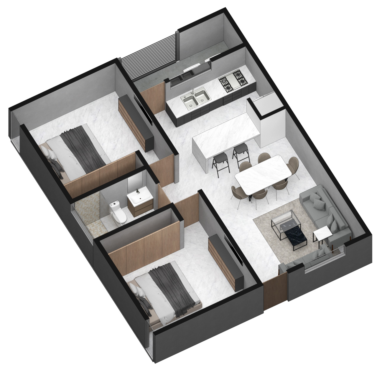 The project is structured as two parallel volumes connected by a central circulation core, establishing a clear separation between private living spaces and shared access. This configuration defines a simple spatial logic and maintains legibility across all levels.