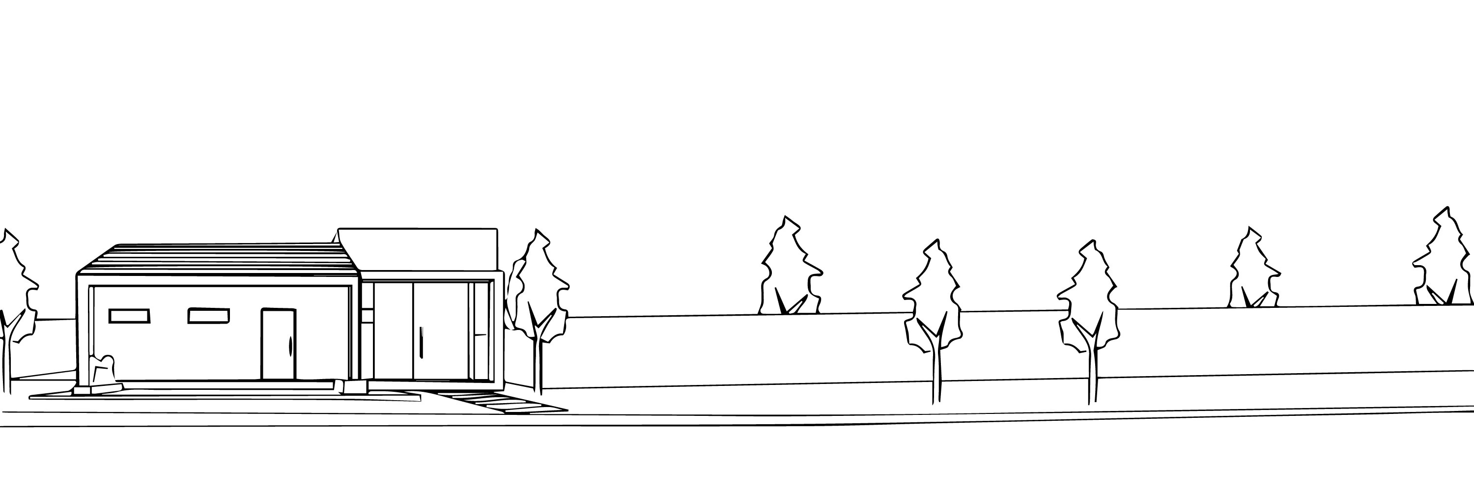 The house is positioned along a gently sloping terrain, with access from the upper level and openness oriented toward the rear landscape. Spatial organization prioritizes clarity and ease of movement, allowing all primary functions to operate on a single level.